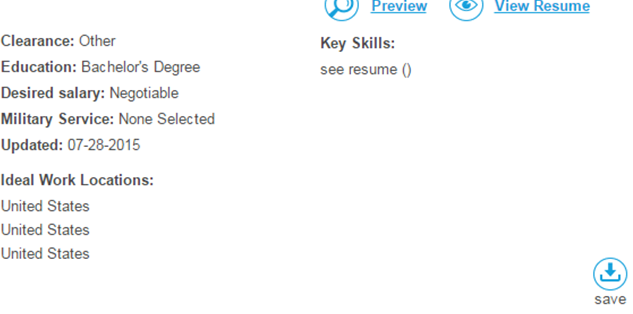 The job seeker profiles below — as viewed from the recruiter’s perspective — effectively present a solid overview of the individual and a diversity of experience. For example, both profiles below show job seekers with multiple skills and various levels of experience. Note the “View Resume” button where the recruiter clicks to view your resume: